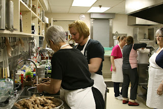 The Soup Kitchen staff, 30 years of big hearts and big smiles. Pat runs the kitchen and mixes bread mix here.